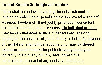 That program has little oversight or accountability. It might be the model for whatever administrative organization would dispense tax dollars to religious organizations, Shapiro says. That organization would have to decide how to handle such possibilities as, say, a Muslim madrassa applying for funds, or a Satanic organization doing the same. The wording of the amendment prohibits the government from denying money based on religious grounds. The key line in the proposal: ?No individual or entity may be discriminated against or barred from receiving funding on the basis of religious identity or belief.?